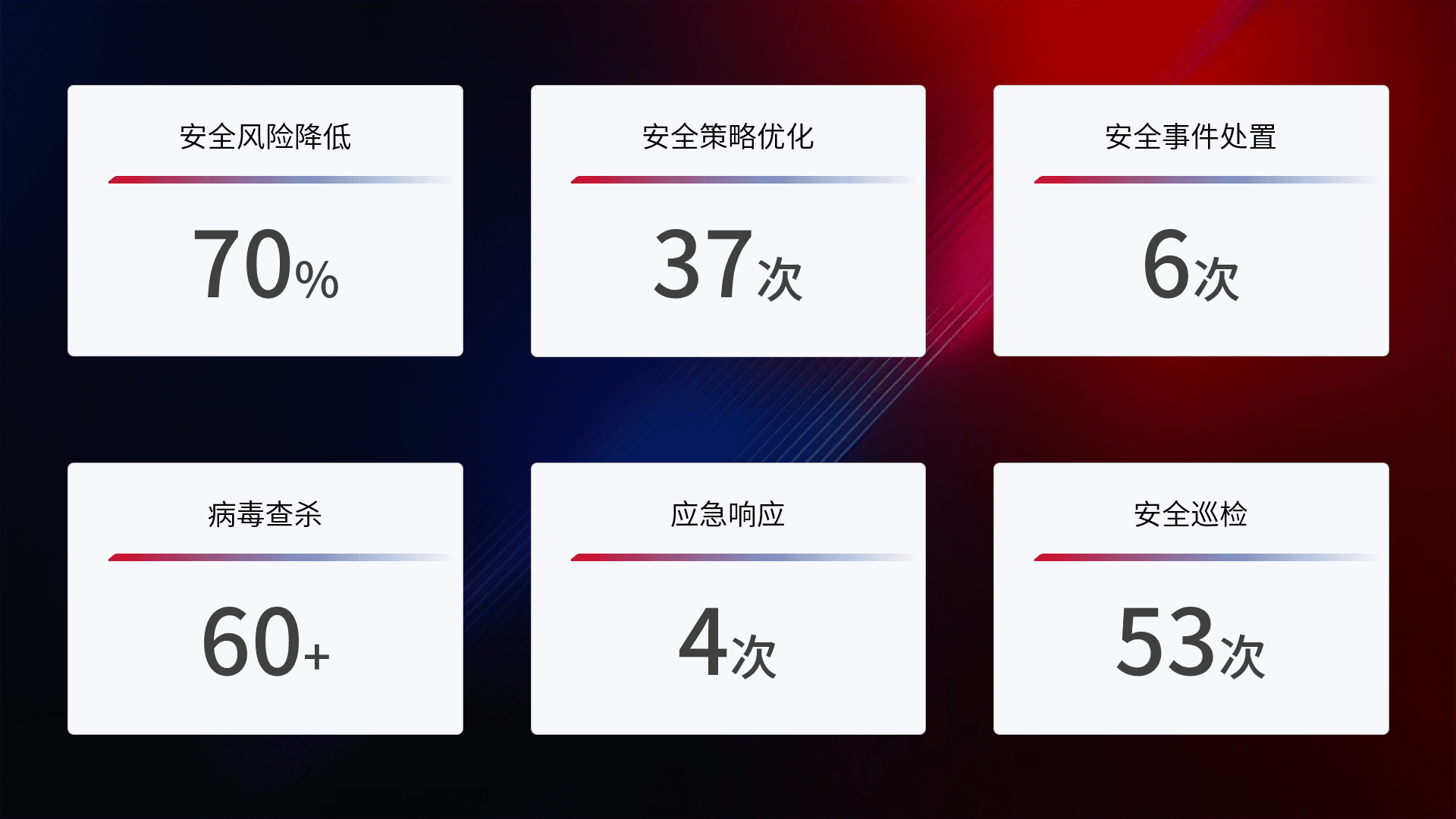 提供全面的安全事件报告体系,,包括处置报告、、周报、、季度和年度总结,,,结合持续监控,,帮助客户深入了解网络安全状况。。。