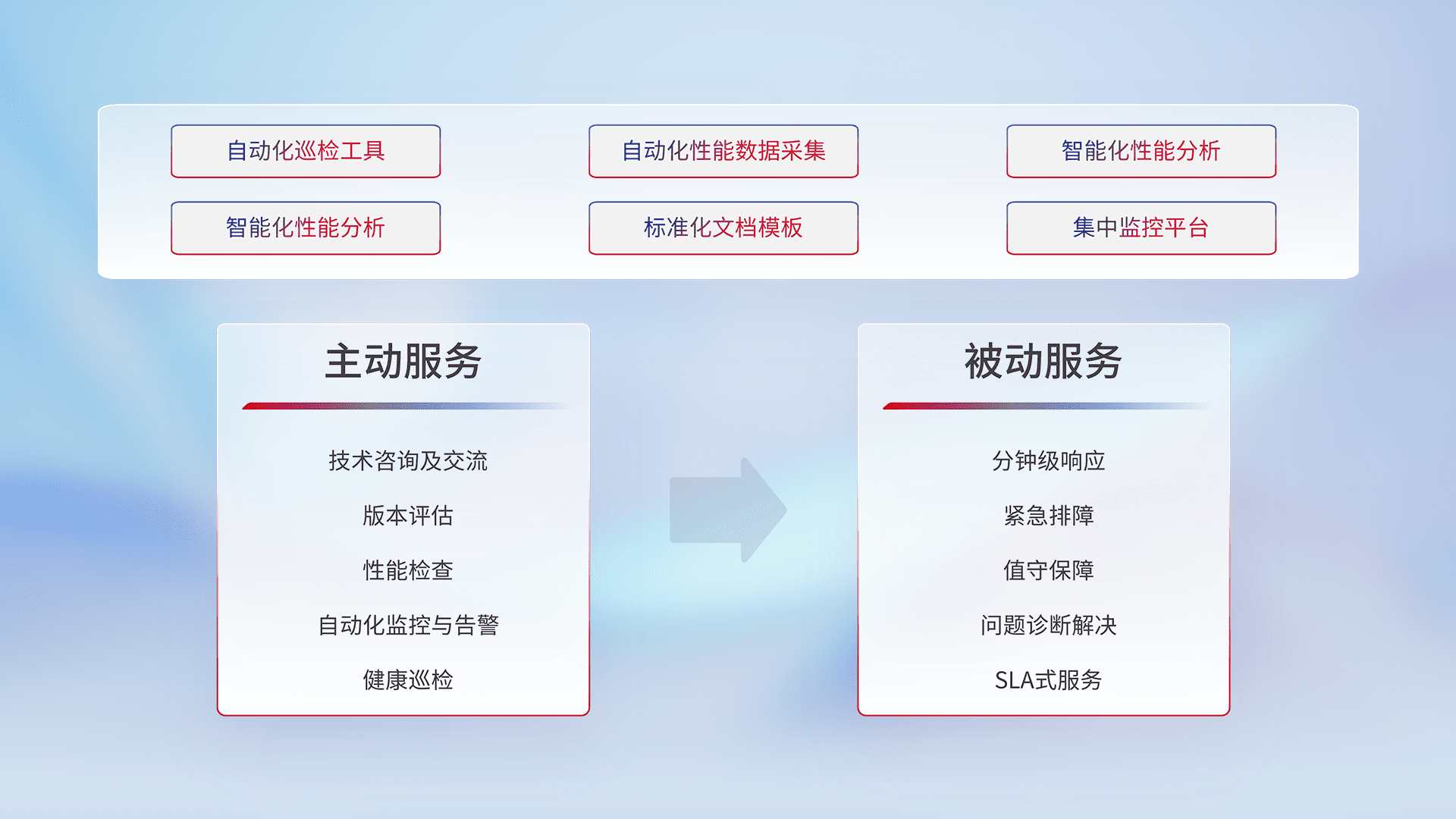 智能化工具和标准化文档,,,,保障服务质量,,提供主动服务(包含技术咨询、、、版本评估、、性能检查、、自动化监控与告警、、健康巡检)和被动服务包含(分钟级响应、、、紧急排障、、、值守保障、、、问题诊断解决、、、、SLA服务)。。。